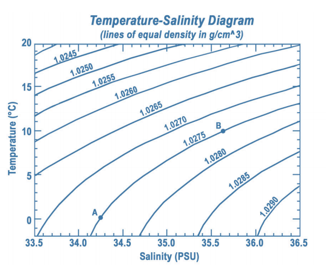 A Temperature-Salinity (T-S) Diagram is a simple, but powerful tool used in studies of seawater density, mixing, and circulation. In a T-S diagram, temperature is plotted along the vertical axis in degrees Celsius and salinity is measured along the horizontal axis in PSU. Seawater density is illustrated in the diagram by curved lines of constant density.