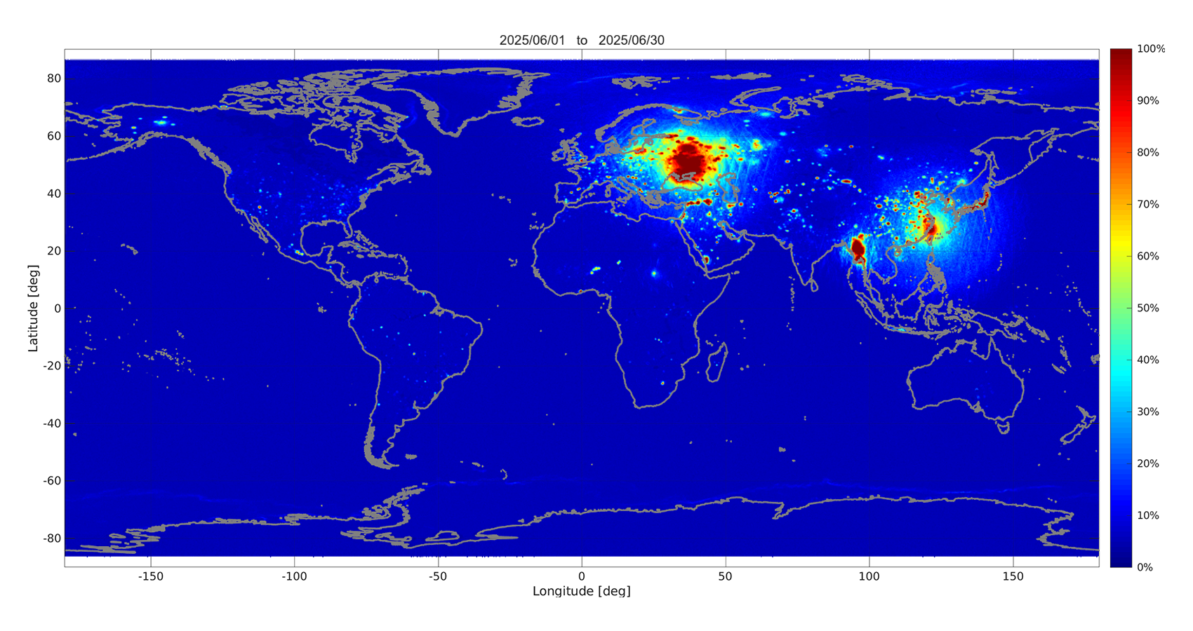 The maps on this page show the percentage of SMAP samples that were flagged as radio frequency interference (RFI) and removed during data processing.