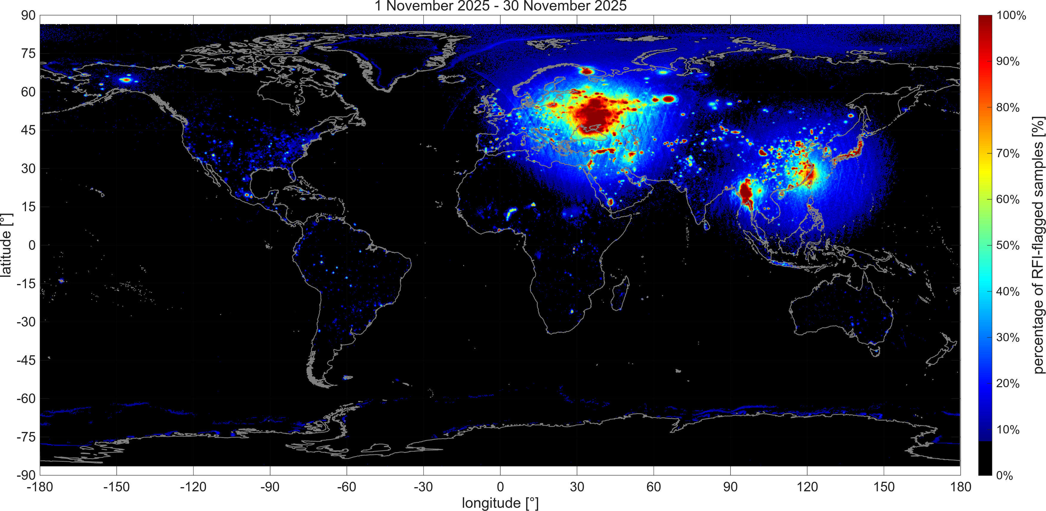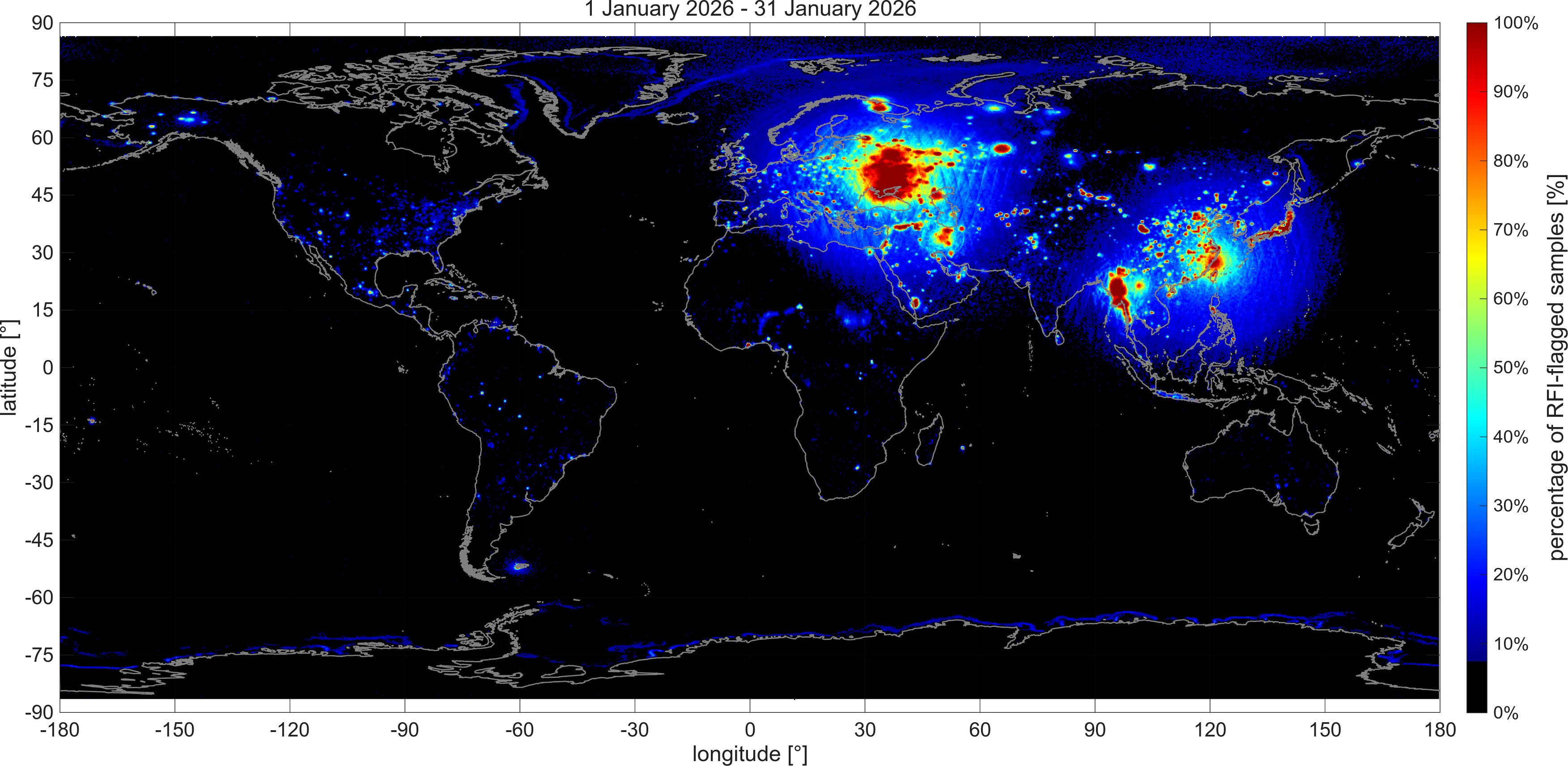 Averaging smooths the data but also raises an issue with false alarms. False alarms are inherent in the detection algorithms (i.e., selecting thresholds is a compromise between missing RFI and eliminating data). Even optimum thresholds will result in false alarms. Because there are many detection criteria for each footprint and each 0.25° x 0.25° resolution cell contains several footprints, there is always some likelihood of erroneously detecting RFI in each map grid cell. The result is a background of a low value of “false” RFI over the entire map. This can be misleading, especially over the ocean where the true level of RFI is low. To solve this problem, the maps presented on this page have the color scale set to black (no RFI) when the percentage of RFI is below 7%. With this choice (set by testing different levels), the maps highlight the true RFI and avoid the misimpression of low levels of RFI over large areas of the ocean. In addition, large changes in antenna temperature such as those occurring between land and water along coastlines can be erroneously interpreted as RFI. The RFI detection algorithm has been tuned to minimize this problem. However, the same approach cannot be used at the ever-changing boundaries between sea ice and water, which therefore appear as faint lines in the sea close to Antarctica and the Arctic Ocean.